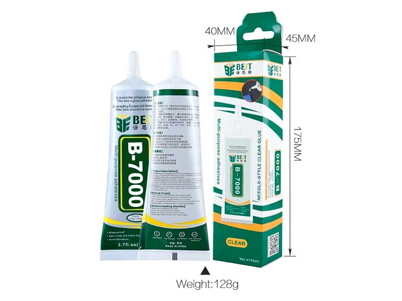 Cu o elasticitate mare, film moale, rezistență la vibrații și impermeabilitate la apă, adezivul B-7000 de 110 ml poate lipi o varietate de materiale, precum metalul, sticla, ceramica, piatra, lemnul de bambus, material textil, piele, PE, PP, PVC, ABS, nylon, spumă, film, materiale textile, componente electronice, plastic, cauciuc, fibră, hârtie, sticlă, strasuri și alte materiale, având proprietăți de lipire foarte bune.