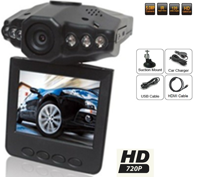 • 720P HD 1280 x 720 • Car Digital Video Recorder with 120 degree wide view-angle • 2.5 inch TFT LCD display, with 270°rotation • Image Sensor: 1/4 High resolution CMOS sensor • Video recording and playing function • Recording resolution(HD): HD 720P (1280x720), VGA (640x480) @ 30fps • Video format: AVI (MJPEG decoding format) • Supports real time playback • Recording mode: automatic records when car power is on • Support motion dection • Cycling records automatically, over-write if memory is full, • Seamless connection between each recorded video section • After car power is off, Li-ion battery will supply 10sec. power to prevent video files loosing • 2.0 Megapixel high resolution digital camera • Snapshot resolution: 2M (1600*1200), 1M (1280*720), VGA(640*480) • Support Real Time & Date display on video and snapshot picture • SD/MMC card socket: support up to 16GB (inclusiv) • Built-in microphone • Built-in 6 IR LED for night vision • Control buttons: Mode,Down,Up,Rec/Snap,Menu, ON/OFF,Reset • Connecting ports: Mini USB port, HDMI output, DC 5V input port • USB port: high-speed USB 2.0 connect to computer for upgrade and backup • Power supply: Car charger power supply, built-in rechargeable Li-ion battery (550mAh for max 2 hours) • Power input: DC 5V 1A, equiped with overvoltage protection • Work temperature: - 35°~ 70° centigrade • Package Contents: Car DVR, Suction mount, Car charger(cable length: 3.5meters), AV out cable, Manual(English) • Unit dimension: 9.8 x 7.5 x 3.0cm