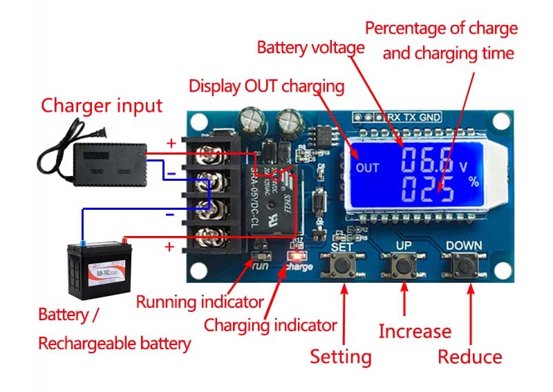 By setting the volt-HI:‘UP’ volt-LI:‘dn’;When the battery voltage is below the volt-LI:’dn’,the relay leads,the charger begins to charge the battery;when the battery voltage is up to volt-HI:’UP’,the relay is diconnected and the automatic charge is completed once;