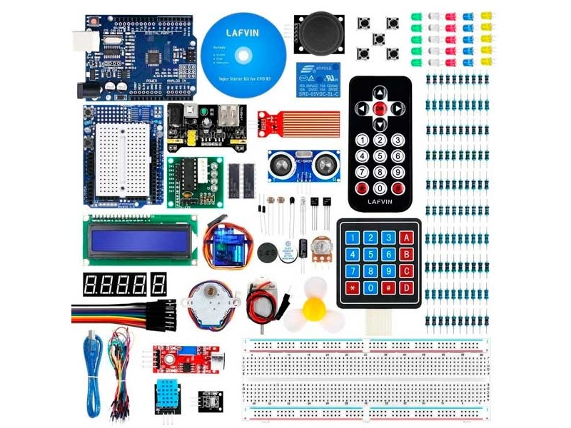 Pachet complet pentru inițierea în programarea și utilizarea platformei Arduino, echipat cu placă UNO și diverse componente electronice, inclusiv motor pentru proiecte practice.