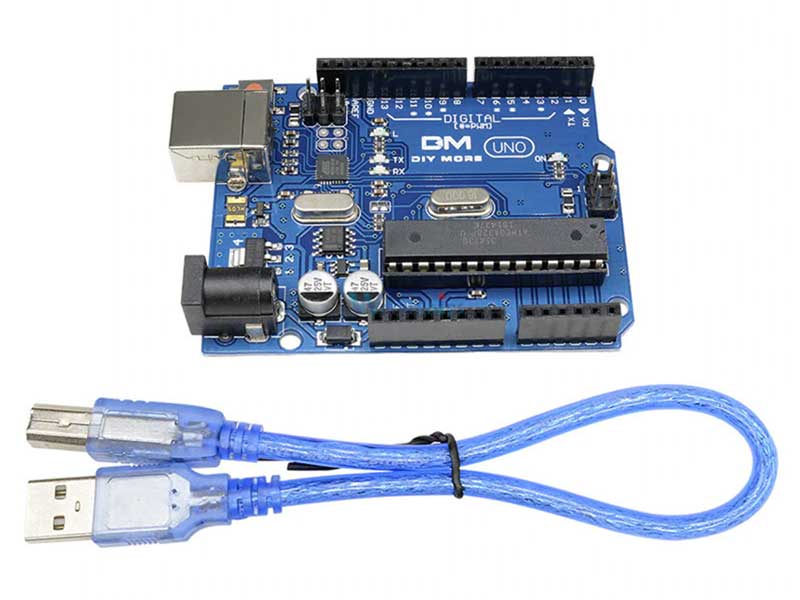 Arduino Uno R3 este o placa de dezvoltare bazata pe microcontrollerul ATmega328. Are 14 pini de intrare/iesire (dintre care 6 pot fi folositi ca iesiri PWM), 6 intrari analog, un oscilator de 16MHz, o conexiune USB, mufa de alimentare, si un buton de reset.