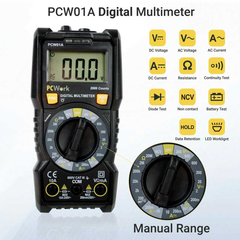 Resistance: 200Ω/2kΩ/20kΩ/200kΩ ±(1.0%+3); 2MΩ/20MΩ ±(1.5%+3)