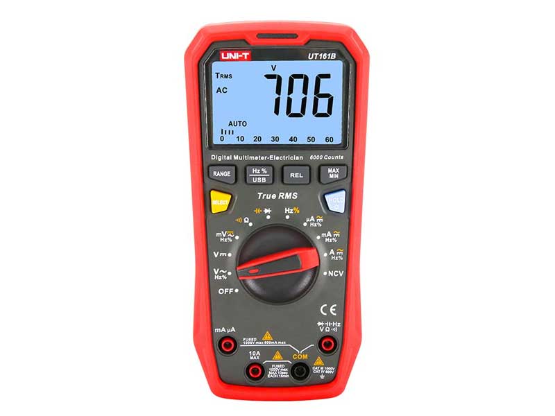 Multimetrul digital UT161B True RMS (măsurare RMS) este un multimetru versatil și ușor de utilizat din noua serie profesională UT161 de la UNI-TREND. Poate măsura tensiunea AC/DC, curentul AC/DC, rezistența, capacitatea, temperatura și sarcina. Multimetrul este echipat cu un afișaj iluminat din spate de 6000 de contor și o funcție analogică de bargraph care afișează citiri precise chiar și în medii întunecate. În plus, UT161B poate efectua testarea diodelor și a continuității, precum și testarea tensiunii de contact nedirect (NCV). De asemenea, este echipat cu o alarmă sonoră și vizuală pentru a vă avertiza atunci când măsurați tensiune, curent sau temperatură înaltă. Alte caracteristici includ o funcție de stocare a datelor cu mod max/min/relativ și protecție de intrare.