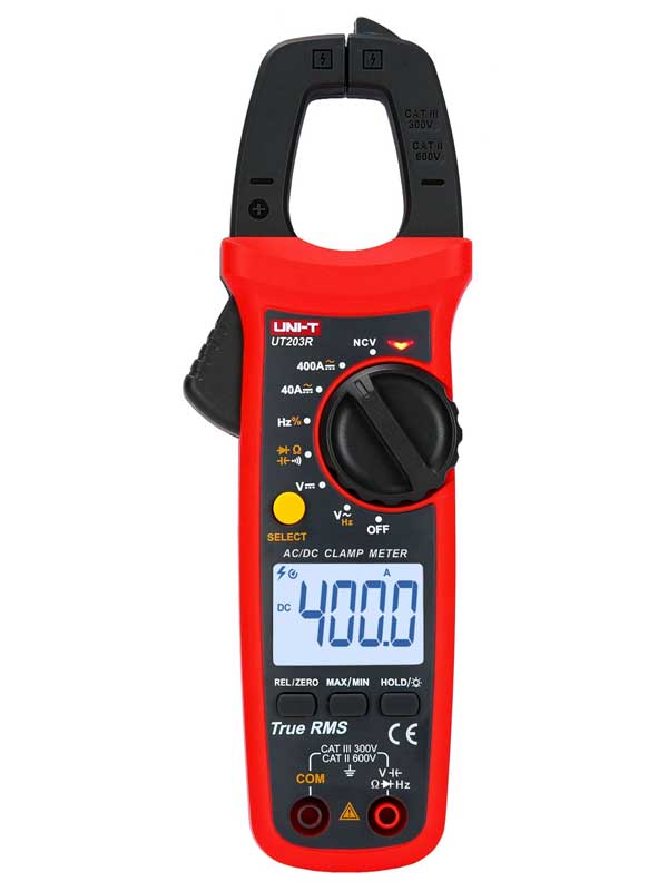 UT203R este unul dintre cele mai puternice instrumente de măsurare a curentului cu clește de la UNI-T. UT203R, un aparat de măsurare digitală a curentului True RMS, poate măsura nu numai curentul alternativ, ci și curentul continuu. De asemenea, poate măsura și tensiunea alternativă/continuă, rezistența, capacitatea și frecvența. Datorită caracteristicilor sale, UT203R poate fi folosit pentru o varietate de sarcini de măsurare. Un afișaj cu 6000 de conteuri asigură valori de măsurare precise, în timp ce deschiderea cleștelui de 28 mm și funcția de detectare a tensiunii fără contact (NCV) oferă funcții suplimentare utile pentru mai mult confort și siguranță. Alte caracteristici utile includ funcția de memorie a datelor cu modurile MAX/MIN și relativ, un test de diodă și continuitate, un indicator pentru nivelul scăzut al bateriei și funcția de oprire automată.
