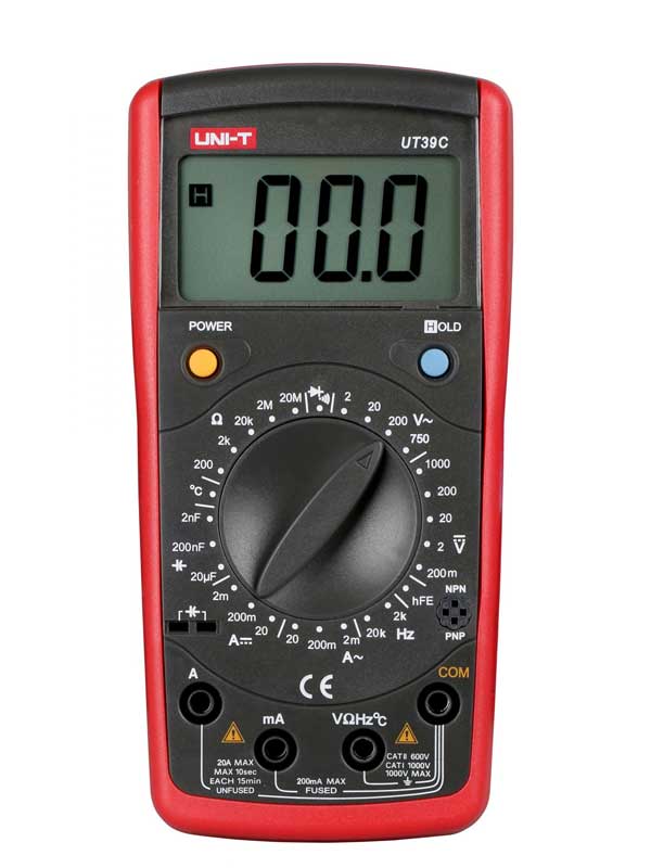 Designul clasic se întâlnește cu funcționalitatea modernă. UT39C este un multimetru digital care poate măsura tensiunea AC/DC, curentul AC/DC (până la 20A) și rezistența. De asemenea, poate măsura capacitatea, frecvența și temperatura. Funcțiile și intervalele de măsurare sunt selectate manual de către utilizator (selectare manuală a intervalului de măsurare). Afișajul de numărare din 1999 oferă citiri precise, iar funcția de păstrare a datelor permite utilizatorului să salveze datele de măsurare pentru a evita măsurători duble inutile. Capacitatea, diodele și tranzistoarele pot fi testate și cu UT39C. În plus, indicatorul bateriei descărcate arată când este timpul să schimbați bateriile.