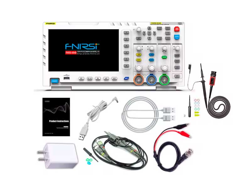 FNIRSI-1014D is a two in one oscilloscope and signal generator launched by FNIRSI. It has comprehensive functions and high practicability. It is a cost-effective dual channel desktop oscilloscope for the maintenance industry and R & D industry. The oscilloscope has a real-time sampling rate of 1GSa / s and 100MHz* 2 analog bandwidth; complete trigger function (single time / normal / automatic), both for periodic analog signal and aperiodic digital signal can be used freely; built in DDS function signal generator and the industry's original chopping output (@ 2.5vpp), all signal frequency step is 1Hz, support 14 kinds of standard function signal and a customizable chopping signal, chopping The output device intercepts part or the whole part of the complex signals measured by the oscilloscope as the output signal of the signal generator, which can store up to 1000 customized cut-off signals; the built-in high-voltage protection module can tolerate up to 400V continuous voltage, without worrying about the oscilloscope burning accident caused by the probe not moving to 10x gear. Large time base scrolling mode, which can monitor slow level changes; equipped with efficient one button auto, which can display the measured waveform without tedious adjustment; display high-definition LCD with 7-inch 800 * 480 resolution; cursor measurement function, when manually reading amplitude and frequency parameters, it does not need to read the background scale unit and quantity, and it does not need to convert to directly get peak to peak and frequency Extremely convenient screen capture and waveform storage function, built-in 1GB storage space, can store up to 1000 screen capture pictures + 1000 groups of waveform data, the storage process is simple and fast, save the current waveform with only one click, no cumbersome prompts and choices to save the current data, very convenient; powerful waveform image manager, support thumbnail browsing, view, view details The functions of page turning, deleting and waveform enlarging, reducing and moving are convenient for secondary analysis. The fuselage is equipped with USB interface, which can be connected with the computer to realize the sharing of its own screen capture pictures and the computer, which is convenient for secondary analysis; Li Shayu's graphic display function can be used to compare and judge the amplitude, frequency and phase of two groups of signals; FFT viewing function can estimate the harmonic component of signals; Li Shayu's graphic display function can be used to compare and judge the amplitude, frequency and phase of two groups of signals;