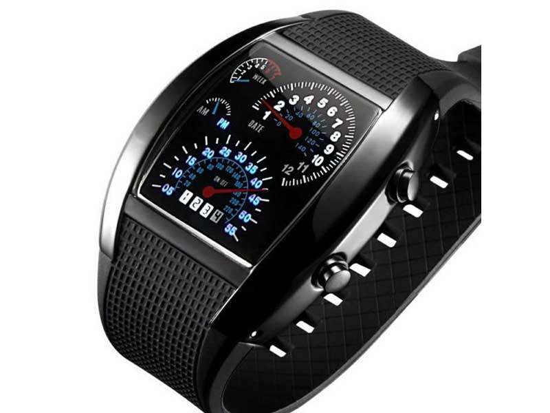 Afișează data și ora folosind o imitație a ceasurilor de bord auto. Iluminarea albastră se remarcă perfect pe fundalul negru al cadranului ceasului. Datorită tehnologiei LED cu consum redus de energie, ceasul nu necesită schimbări frecvente de baterie. Un cadou excelent pentru orice pasionat de două și patru roți!