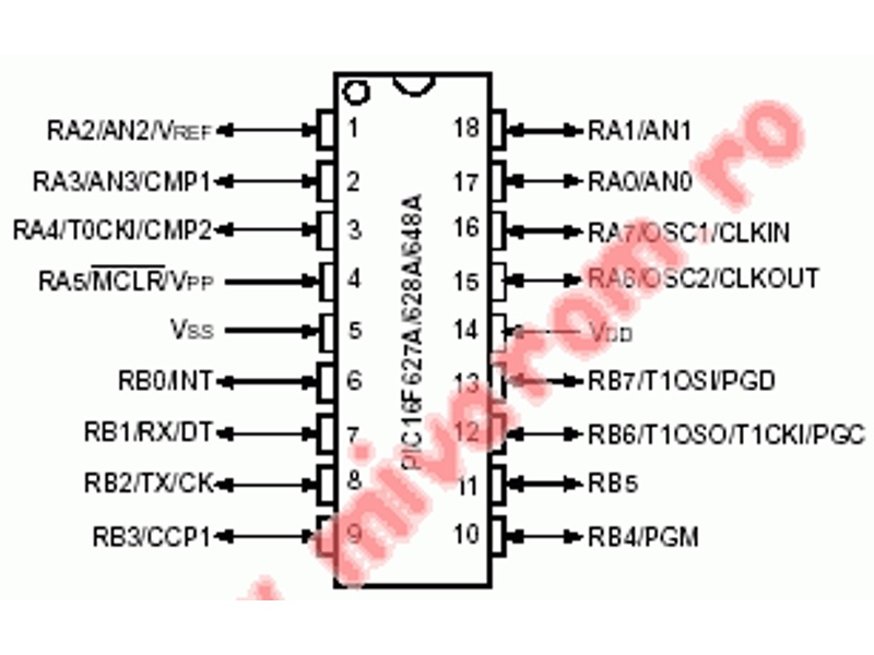 The PIC16F628A is an 18-pin Flash-based member of the PIC16F62x family of fully static CMOS 8-bit microcontrollers. It is upward compatible with the PIC16F628, PIC16C62xA, PIC16C5x and PIC12Cxxx devices. Features include a 4 MHz internal oscillator, 128 bytes EEPROM data memory, capture/compare/PWM, USART, 2 comparators, and programmable voltage reference.