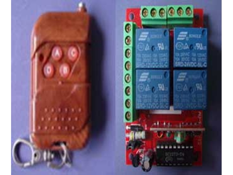 kit complet telecomanda+modul. Mod actiune: fiecare canal are borna comuna plus 2 iesiri, una contact inchis, celalta contact deschis. La apasarea butonului corespunzator canalului ambele iesiri isi schimba starea, cea cu contact inchis devine deschis, si cea cu contact deschis devine inchis. Pentru potrivirea telecomenzii cu receptorul se tine apasat butonul de pe receptor timp de 3 secunde, pana cand ledul receptorului ramane aprins. Astfel receptorul intra in modul de invatare a telecomenzii. Se apasa butoanele de pe telecomanda asteptand dupa fiecare apasare ca ledul sa clipeasca de 3 ori, semn ca butonul a fost invatat