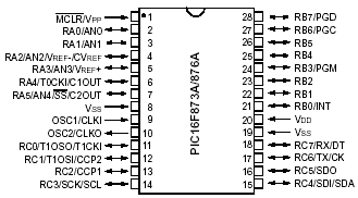 The PIC16F876A CMOS FLASH-based 8-bit microcontroller is upward compatible with the PIC16C5x, PIC12Cxxx and PIC16C7x devices. It features 200 ns instruction execution, 256 bytes of EEPROM data memory, self programming, an ICD, 2 Comparators, 5 channels of 10-bit Analog-to-Digital (A/D) converter, 2 capture/compare/PWM functions, a synchronous serial port that can be configured as either 3-wire SPI or 2-wire I2C bus, and a USART. Microchip PIC16F876A Microcontroller Features High-Performance RISC CPU - Operating speed: 20 MHz, 200 ns instruction cycle