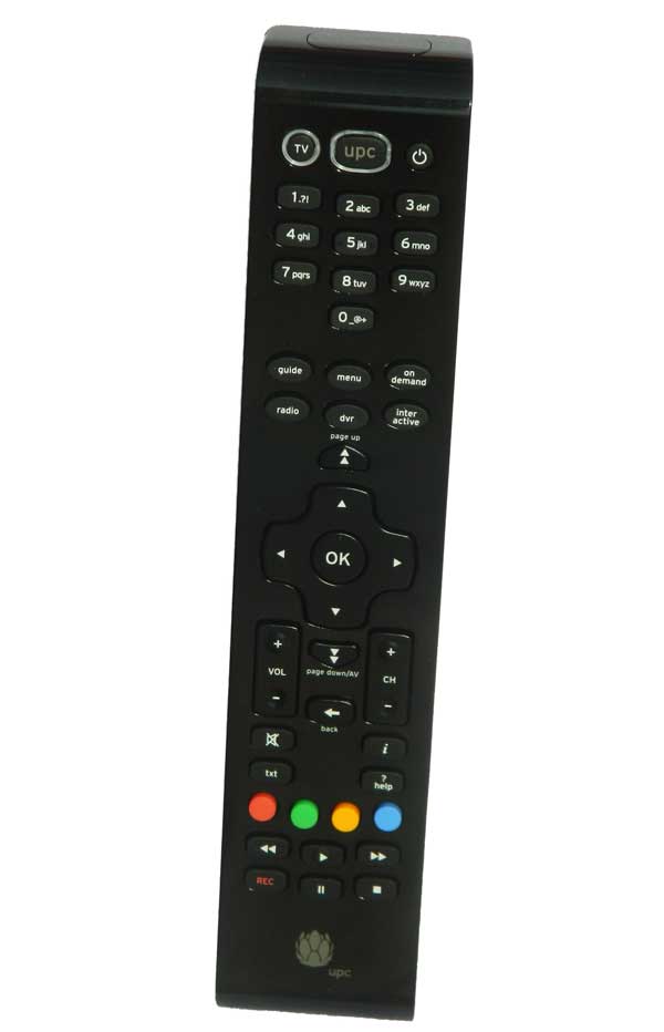 - Apasa OK si butonul rosu simultan.Asteapta pana cand ''UPC'' se aprinde de doua ori pe telecomanda si apoi elibereaza butoanele.