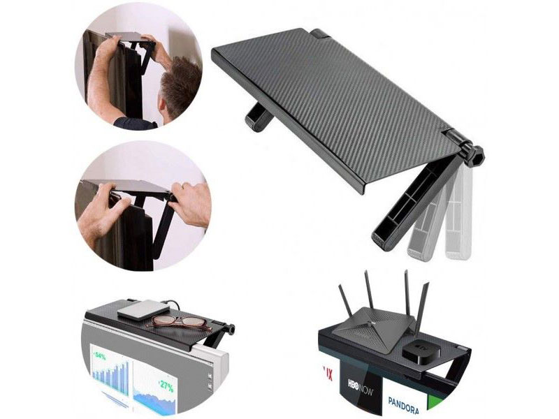 Etajeră practică din plastic ABS, montabilă pe partea superioară a unui televizor sau monitor. Ideală pentru organizarea telecomenzilor, boxelor mici sau accesoriilor de birou.