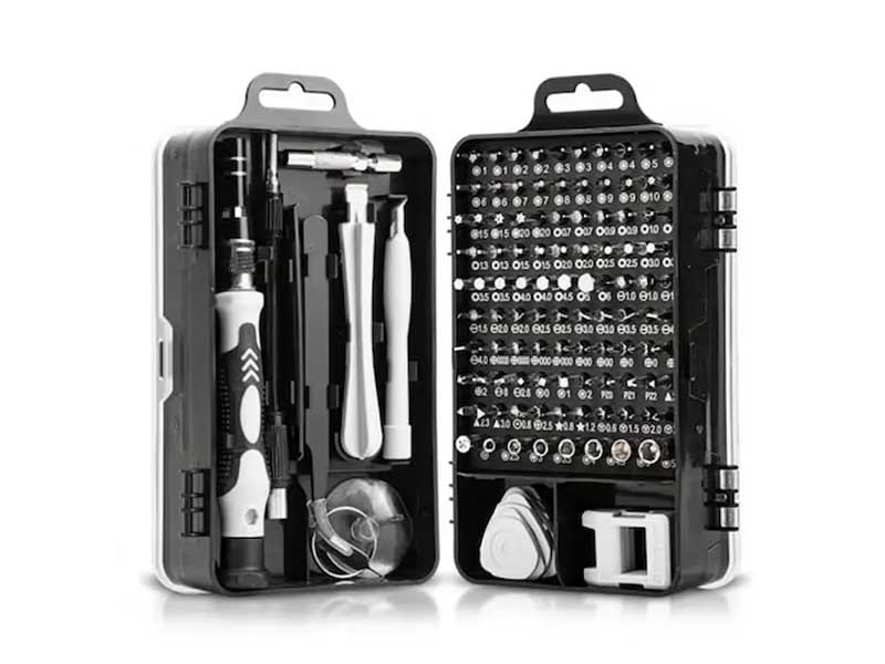 Setul contine capete de precizie, surubelnite, penseta cu varf ascutit, magnetizator/demagnetizator, ventuza pentru indepartarea sticlei, pin pentru carduri SIM si deschizatoare de carcase. Fiecare piesa dispune de propriul loc pentur depozitare. Carcasa este confectionata din material ABS rezistent, fiind foarte usor de transportat. Specificatii: - set 115 scule de precizie; - ideal pentru repararea oricarui aparat electrocasnic sau dispozitiv electronic; - trusa este foarte compacta fiind usor de luat oriunde; - potrivit pentru reparatii simple si complexe: electrocasnice, ceasuri, bijuterii, etc; - 98 capete interschimbabile, - maner surubelnita cauciucat; - penseta cu varf ascutit; - magnetizator/demagnetizator; - ventuza pentru indepartarea sticlei; - pin pentru evacuarea cardului SIM (microSIM, nanoSIM); - carcasa cu inchidere tip clema; - biturile de surubelnita sunt fabricate din otel crom-vanadiu pentru utilizarea pe termen lung; - utila atat in ateliere cat si acasa; - dimensiuni trusa 18x11x5.2 cm; - culoare negru.