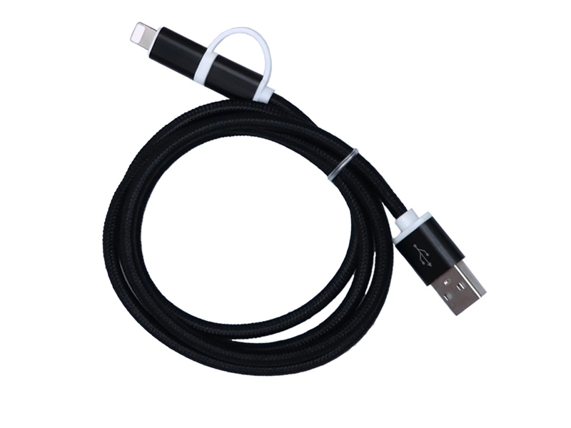 Cablu de alimentare și transfer date cu dublu conector, compatibil atât cu dispozitive microUSB, cât și cu iPhone. Fabricat din material textil rezistent, ideal pentru utilizare zilnică.